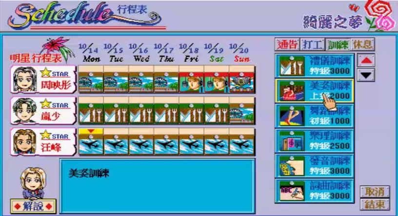 (这充满年代感的画风,洋溢着一股中老年表情包的气息。在Windows 98还没问世的1995年,这样的画面已经算是非常精致了) 游戏中,角色命名构想来源于 现实中的艺人 。 “魅力绽放”经纪公司: 苏德华(刘德华)、刘倩文(叶倩文)、辛学友(张学友)、海潮伟(梁朝伟) “神采艺术”经纪公司: 张富城(郭富城)、吕佑民(吕方)、沈艳芳(梅艳芳)、李忆莲(林忆莲) 我怀疑是游戏策划想不出那么多名字故意偷懒的,不过这确实让玩家 更有代入感 。 《明星志愿2》
