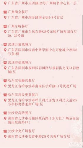 玩家购买肯德基明星 套餐后,可以获得一张闪卡,限量得哦! 恋与制作人肯德基闪卡有什么: 闪卡能刮出兑换码,里面只有1-5(其实大部分就是1-2)张的星河券。每个账号能兑换五次。 然后KFC官网上面有个接电话的也有兑换码,那个码就一个帐号只能兑一次,里面是金币+体力+告白心愿。 肯德基礼品卡套卡值得买吗: 200元的礼品卡,对于喜欢吃KFC的小伙伴来说还是挺划算的,因为200元的固定金额,想吃什么就从里面扣就行了。 如果不喜欢吃KFC,制作人们可以和别人商量一下,你要卡,别人要账户余额。具体的商量分摊即可。 恋与制作人肯德基餐厅位置: 以下这些城市门店可以看到恋与制作人装饰: