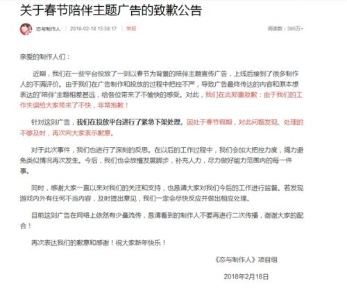 春节期间,恋爱休闲游戏《恋与制作人》推出的一组以“陪伴”为主题的真人广告,没想到引发争议,官方在微博进行了道歉。 《恋与制作人》官方称,其在广告制作和投放的过程中把控不严,导致内容和主题相差甚远,对此郑重致歉,并对该广告进行了下架处理。