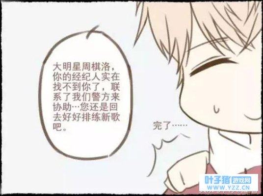 过了一会儿,周棋洛对他说,我可是背着经纪人偷偷出来的,饿不饿呀?我带你去吃饭吧,吃完饭我们再去看个电影首映好不好?可是他的话刚说完,还没等到悠然的回应,后边传来一个冷冷的声音,大明星,周棋洛,你的经纪人实在找不到你了,联系我们警方来协助,您还是回去好好排练新歌吧,周棋洛脸上的笑容还没有落下,便尴尬的呆立在原地,卧槽,老子就是出来和薯片小姐吃个饭,居然还把警察给搞出来了!