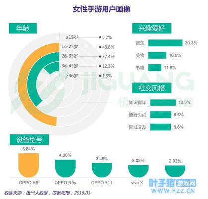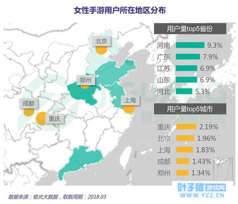 这几个城市的女性用户最多 根据极光大数据的统计,女性手游用户中48.8%为16-25岁,爱好音乐。而这些女性手游用户在中小城市更为集中,63%女性手游用户来自三线及以下城市,6.3%来自一线城市。其中,重庆、北京和上海为女性手游用户占比top3城市,而河南省是女性手游用户第一大来源省份。