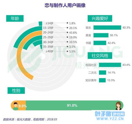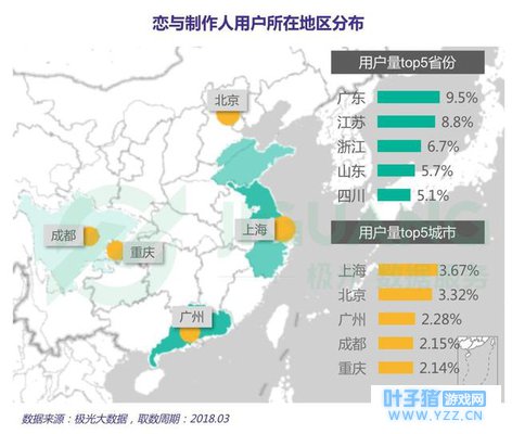 《恋与制作人》:女性用户超9成、上海玩家最多 根据极光大数据显示,《恋与制作人》用户中43.6%为20-24岁,女性用户占比91%。用户中32%来自一线或新一线城市。广东、江苏、浙江为《恋与制作人》用户占比top3省份,而上海则是《恋与制作人》用户最集中的城市。