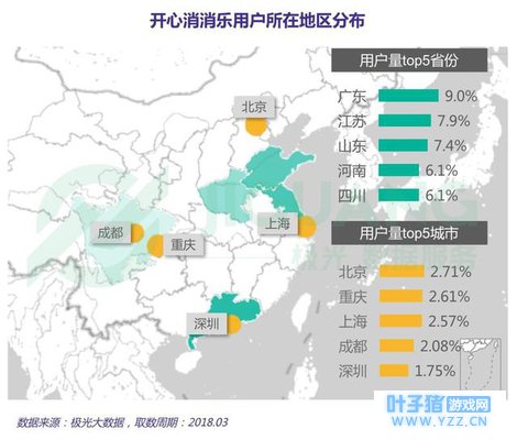 《开心消消乐》:女性用户超6成、北京玩家最多 在最受女性用户欢迎的手游中,《开心消消乐》以月均DAU 2710.4万,MAU 8924万的数据遥遥领先。根据极光大数据统计,《开心消消乐》用户中27.9%为25-29岁,66.1%为女性用户。《开心消消乐》用户在一二线大城市相对更为集中。《开心消消乐》用户中43.5%来自一线、新一线或二线城市。 广东、江苏、山东为开心消消乐用户占比top3省份,《开心消消乐》用户最集中的城市是北京,这里聚集了2.71%的《开心消消乐》用户。