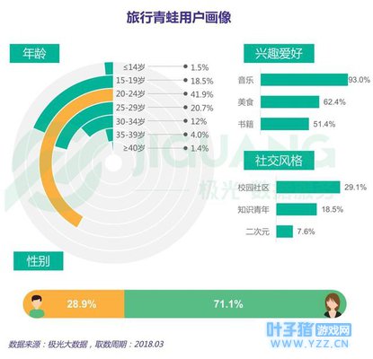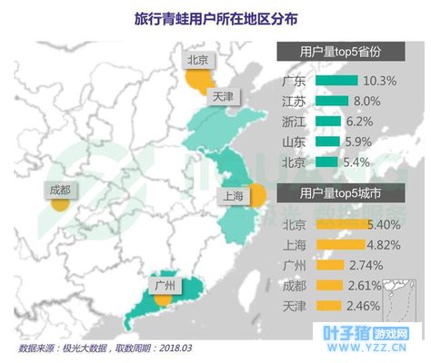 《旅行青蛙》:女性用户超7成、广东玩家最多 根据极光大数据显示,《旅行青蛙》用户中41.9%为20-24岁,女性用户占比为71.1%。用户中38.6%来自一线或新一线城市。北京、上海和广州为《旅行青蛙》用户占比top3城市,广东则是《旅行青蛙》用户最集中的省份,其用户占比为10.3%。■