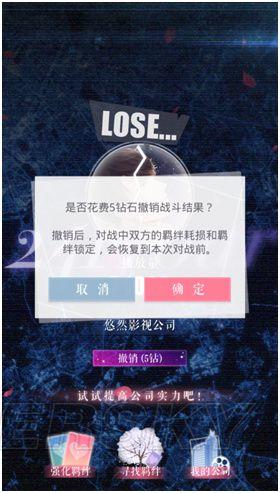 6、战斗失败后可以恢复到挑战前的状态 战斗失败后,点击[撤销]按钮,花费5钻石,可以回到没有挑战当前失败关卡的状态。 不选择[撤销],将会重新回到关卡选择界面,这个时候羁绊状态是战斗失败后的损伤状态。可以选择再次挑战失败的关卡。 [小技巧]如果感觉当前挑战失败是策略有误,可以选择[撤销]重来。