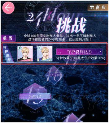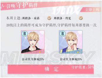 7、受损的羁绊不会恢复,受损状态延续到下一关卡中,直到下一次重置。 8、若羁绊的四个属性数值均为0(即受损100%),该羁绊在后续关卡中不可上阵。 9、受损状态仅限于本系统内,在游戏的其他地方没有影响。 守护羁绊 上阵指定羁绊,每张可以带来25%的公司属性加成,两张可加成50%,24关内均有效!守护羁绊每周都会更换! 守护羁绊需要等级达到20级即可,没有指定羁绊时,选择其他羁绊上阵也可以获得加成。 [小技巧]上阵守护羁绊!最高可获得公司实力50%的数值加成!可能这就是决定胜负的关键。