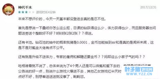 有一位玩家在谈及放弃《恋与制作人》的原因时,坦言:“太贵了,氪不起,贫穷的我养不起四个野男人。满级sr比不过一个ssr,隐隐觉得恋与在下调卡池抽中sr和ssr的概率,不重氪后面的章节基本很难过关。” 第三:请重视游戏的运营和维护,让玩家的金钱投入有见效 我们不知道叠纸科技是不是真有“捞了钱就跑”的想法;如果有请立即停止,因为目前《恋与制作人》在游戏运营维护的投入与我们玩家的金钱投入的确是远远不平衡的。“操作体验差、活动骗氪、掉落率太低、平衡性不好、官方态度不积极甚至拉黑粉丝;内测时的问题没解决,就着急公测。”,这些槽点,你们不仅要知道还要克服。