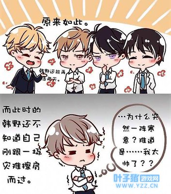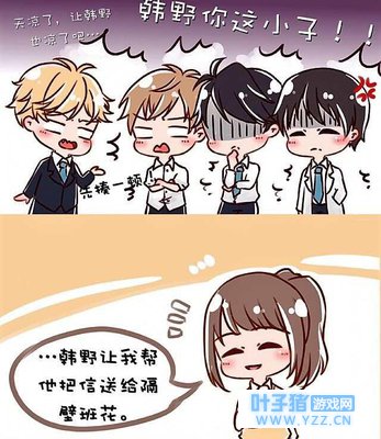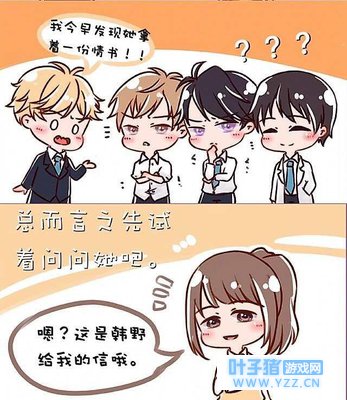 经过四人的决定,对于悠然拿着情书达到这件事情,还是找她先试着问问为好,不能往下判断。于是四人来到悠然小姐姐的面前,询问了早上信件的事情,悠然十分高兴的告诉了他们四个人“这是韩野给我的信哦”!听到悠然如此肯定的回答。四人的表情瞬间变了样,周棋洛首先提议“天凉了,让韩野也凉了吧!”而白起却好“先走一顿”,李泽言此刻沉默不语,许墨也是一脸无奈的表情。估计四个人心理估计都在想着“韩野你这小子”!
