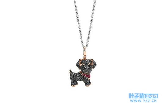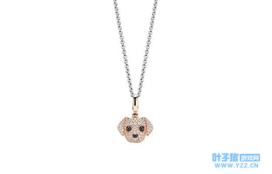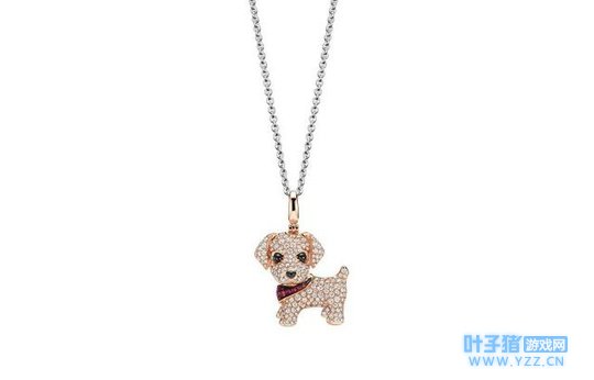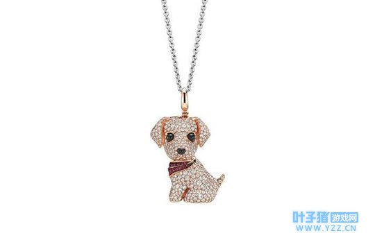 金毛寻回犬Bella性格淡定冷静、服从性强 是一只随时准备帮助盲人或视障人士的导盲犬 设计师为金毛狗狗的吊坠设计了坐姿、站姿以及狗头3种不同造型的吊坠 采用18K玫瑰金打造,狗狗全身密镶钻石,并在围巾上镶嵌粉红色蓝宝石 从颜色到造型都最真实地还原了一只可爱的小金毛犬。
