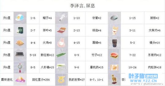 然后如果是要升到三颗星的话,就需要五个茶叶,四个钱包还有六个大柴犬了。属于第二章和第三章的掉落道具了。四颗星的材料主要是要八个火鸡,六个围裙和十个罐头,属于第四章第五章的材料。 然后就是五星,五星需要十二个数位板,十二个竹子十二个东坡肉。 这个时候也可以考虑进化了,这个卡牌进化主要是需要我的发带和李泽言的骆驼。