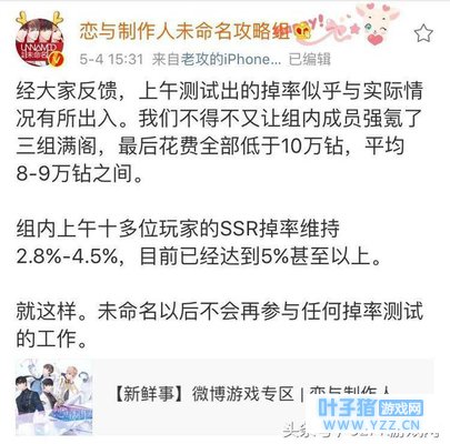 而中午攻略组又发布微博表示中午的概率与早上略有不同,自己又组织了三位大佬强氪满阁,发现这次概率却比早上要高出很多。首先全部花费低于十万钻石,并且爆率均达到或者超过5%。由此不少玩家猜测难道叠纸暗戳戳改了爆率吗?