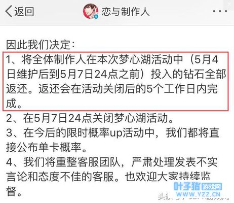 隔天官方表示,在梦心湖开启阶段投入的钻石将全部返还,同时购买礼包抽奖的玩家也将获得等额钻石返还,相当于你花了1000钻石抽奖,活动结束后将返还给你1000钻石。这种解决方式受到了不少玩家的认可,但也有不少质疑的声音,因为卡池并不是立即关闭,从发出公告到卡池关闭有两天的时间差,官方有利用反钻骗氪的嫌疑。