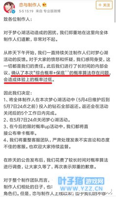 但是,最近发生的官方劝退事件让人哭笑不得。新剧情“极暗之时”发布之后,新活动“梦心湖”接踵而至。早晨6点,许多玩家守着更新卡池一开就开始抽卡,只为了得到四位男人的新SSR卡,毕竟卡面立绘实在太好看,大家都控制不住伸向钱包的手。 谁知时近中午,叠纸官方发现情况不对从服务端偷偷修正了SSR掉率。然后一大堆无氪或者微氪玩家化身欧皇,十连出三个甚至四个SSR,此时问题进一步激化。(无氪:没充钱的玩家;微氪:只充了较少钱的玩家;重氪:花了很大一笔钱的玩家;欧皇:运气好,能抽到想要的卡的人) 恋与制作人未名攻略组在接到大批玩家投诉之后,组织其成员在不同时段氪穿活动卡池,发现早上、中午和下午卡池掉率不同,呈上升趋势。早上概率最低约为2.8%,下午概率最高,达到5%以上。(氪金:充钱;氪穿卡池:充钱抽卡直到获得卡池中的所有活动卡)