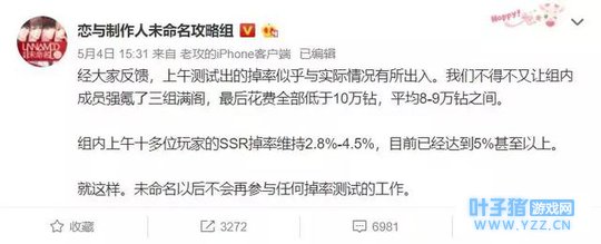 由于是抽卡游戏,抽中SSR的情况自然每个人都有所不同,而且和其它抽卡手游一样,运气不好的玩家也都会或多或少怀疑概率究竟靠不靠谱。如果只是以个别现象作为证据,针对“概率存有问题”的质疑肯定不会被承认,不过玩家们这次拿出的测试数据分量并不小。 在《恋与制作人》玩家群众中,有不少既热心、执行力又强的玩家建立起“攻略组”等组织。除了在技术上帮助普通玩家轻松玩游戏外,还有花费大量金钱实测抽卡概率的数据测试——其中“未命名攻略组”就是一个这样在玩家群体中比较有公信力的组织。而这种抽卡概率的测试,实际上就是通过多组成员和账号不断花钱抽卡,得出抽齐所有SSR的最终成本,也就是玩家所俗称的“氪穿卡池”。 这种测试的可信度到底高不高?在从业者看来,局部的测试和采样并不能代表整个游戏庞大的总数据,但在玩家眼中,攻略组的测试却是除了官方以外,最值得信任的权威——甚至有不少玩家对攻略组的信任远高于官方。 5月4日上午10点,未命名攻略组在微博上公布了此次梦心湖活动的测试结果:“纯十连抽的满阁毕业基本维持在12万钻石以下”。随后在中午,攻略组收到大量玩家反馈,称概率与实际情况有所出入。于是攻略组重新组织三组成员氪穿卡池,并在下午15点31分得出新的数据结果:“花费全部低于10万钻,平均8-9万钻之间。组内上午十多位玩家的SSR掉率维持2.8%-4.5%,目前已经达到5%甚至以上。”