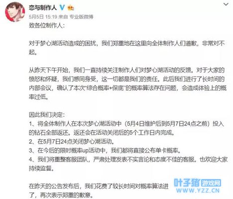 这两组数据也得到了部分其它玩家的印证,玩家对此的理解为早上抽卡12万钻石保底毕业,到下午变成了10万钻石保底毕业。这样的波动,意味着早上的玩家为此付出更多的花费,折算成人民币也是超过1000元的不小数目。 | 一天后,官方发布致歉公告 对于玩家的质疑和攻略组拿出的测试数据,《恋与制作人》官方在5月4日下午18点35分做出回复,首先声明绝对没有修改活动掉率,其次公开保底机制为12万钻。此外,值得一提的是,官方还公布了后台大数据,表示8-12万钻石是玩家抽齐SSR的主要区间。 从官方公布的数据来看,攻略组的测试也是基本相符的,不过有些微差异的地方在于:官方表示保底毕业的区间是8-12万钻石;攻略组的测试结果是上午12万,下午10万。 对此,那些在早上就开始抽卡的玩家,认为官方调整了概率导致自己多花了冤枉钱。而且出于比较主观的理解,一些玩家在与官方工作人员的交流中,用攻略组的测试数据来反驳官方“没有调整概率”的声明。 如果站在从业者的角度,官方和攻略组两方的数据基本一致,有出入的地方也能解释得通。不过再度打脸的是,《恋与制作人》官方在5月5日下午15点19点发布公告称,本次的活动概率算法确实出了问题。