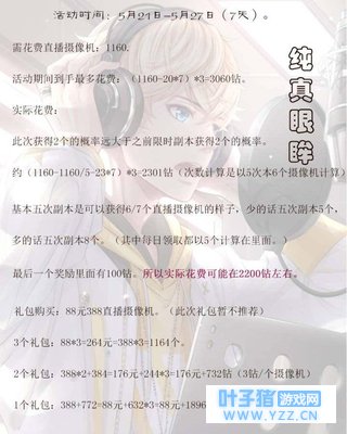 不过这个是按照最低的一个概率来进行计算的,目前的这一个副本,掉落双倍直播摄像机的概率是要高于前一段时间的一些活动的。那么按照这样的一个概率来进行计算的话,实际需要的可能还是在2300钻石左右。 然后是因为这一波最后的活动奖励有一个100钻石,所以说最后需要的钻石可能就是2200钻石,当然这里不排除有一部分游戏玩家特别欧气的情况。