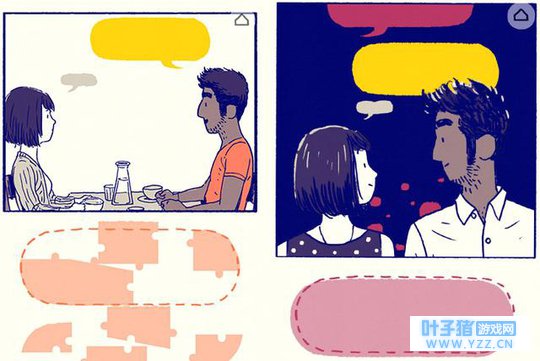 游戏的场景画面渐渐变得丰富起来,玩家只需简单的操作,就能推动情节的发展。 轻轻点击音符,女孩就能够飞跃到男孩身边。简单地拼凑一幅拼图,完成主人公之间的对话。 碎片也从一开始的零零碎碎到一整块.。