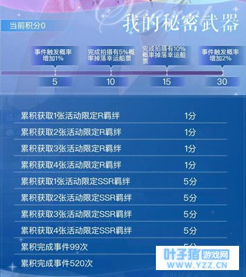 7、【我的秘密武器】 玩家完成【我的秘密武器】列表中的任务,即可获得积分,积分达到指定档位,可自动解锁【我的秘密武器】特殊加成。 解锁特殊加成后,拍摄关卡中将有有几率额外掉落特殊道具【幸运船票】 就是达到指定的档位可以获得对应的效果。 【疑问区域】 因为还没玩就关服了,所以不太清楚,多少就能把90个事件全部拿完,是不是ssr到手必拿到90夏日事件?如果必拿的话最后增加触发概率的意义是什么?如果不是必拿的话,拿到卡了想要全部的夏日事件还要回去重新刷夏日事件吗?不知道是不是理解有误,等具体开服的时候再看看是什么样的吧~ 完成拍摄几率掉落 幸运船票,就是你达到这档位,刷副本的时候,不仅掉落纯白贝壳,还能掉落幸运船票。