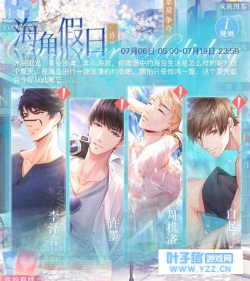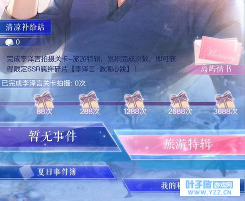 3、免费r卡 288次能到手一张r卡。 5*15+264=339张幸运船票。 所以可以靠免费次数与免费送的船票只能到手一张免费r卡。 4、纯真贝壳兑换 (时间短,没有看到对应界面,所以不知道兑换具体价格,之后再详细给大家参考) 暂时给的是换算成钻石参考 金币与体力以每日最低购买花费计算: 金币*10000约25钻 体力100*约34钻 以下以供给站商店价格换算: 星河许愿券*10=1800钻 告白心愿*10=200钻 羁绊诺言*12=300钻 随机三星课程卡=100钻 5、两周内正常收益: 漫步:400*2=800钻 每日任务:50*15=650钻 签到:85钻(普通)/170钻(特权) 特权:30*15=450钻 即普通玩家可以获得钻1535钻,特权玩家可获得2070钻。 6、夏日事件簿 在男主副本中完成拍摄关卡的过程中,有机会触发海岛限定【突发事件】。每个突发事件有三个命运分支(选项),选择后可额外获得【纯真贝壳】,并将你的选择收录入与该男主的【夏日事件簿】。收集全部事件还可获得额外钻石奖励~ 1. 每位男主最多可触发30种事件,每个事件3个选项,每位男主共计可收集90个夏日事件。 2. 每位男主的【夏日事件簿】可在该男主的活动副本界面点击查看。 3. 【我的秘密武器】中解锁【事件触发概率增加】的相关特殊效果,可增加突发事件的触发几率。