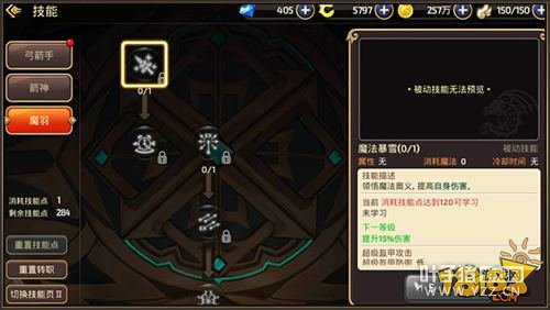 【45级技能】 魔羽45级2个新技能:1,魔法暴雪——被动技能,实际效果就是技能上描述的那样,增加自身伤害15%。没有多余的解释,简单直接,你所造成的所有伤害都提高15%,堪称神技。在没有50级以前,大部分的箭神玩家都会选择魔羽分支,因为狙翎没有聚能射击EX之前,伤害无论是PVE还是PVP都是没有魔羽高的,就是因为这个被动。