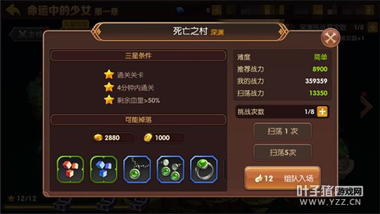 玩家可以在这个界面中进行一系列玩法相关的操作,例如:选择关卡,领取奖励,进入深渊商店,增加可挑战次数以及上下章的切换。我们也可以从这个界面看出,其每通关一个副本就可以领取一个宝箱奖励。当我们选择特定关卡并点击后,我们将进入如下界面: