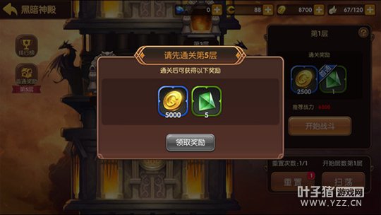 玩法奖励黑暗神殿玩法中,每通关一层就能积累一次金币奖励,所积累的奖励会在战斗结束时进行发放。同时,每层关卡的首次通关都将会获得一个绿色强化材料,每隔5层的首次通关更能在首通奖励按钮中获取高额金币与一定数量的强化材料作为奖励。