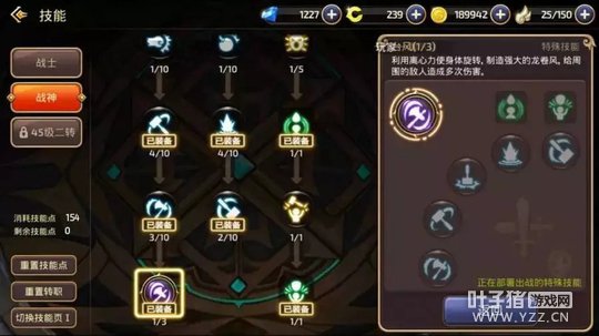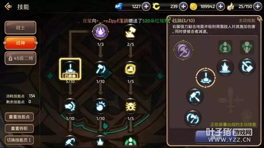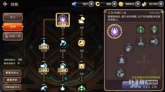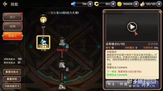 践踏:起手很快,往往可以让对方反应不过来,并且也有着不俗的破甲能力,PVP里很厉害的技能! 旋转冲击:高霸体,可以硬抗很多技能。高破甲,也可以打断对方很多技能。多段伤害,如果打出3段伤害,将会有着很强的压迫性。有着破浮空的能力,PVP必带! 范围炸弹:远程消耗技能,破甲能力很高。 旋风:持续旋转对敌人造成伤害,在敌人没有反击技能时使用,可以造成成吨伤害,也是连招必备技能。 滚动攻击:起手无敌!高破甲能力,高伤害,可以破浮空,也可以当做突进技能使用。 大招台风:1V1或者群体PK都很好用的技能,只要打中人基本跑不掉。 BUFF携带:高地人和铁布衫 PVP要点:有充足的技能再追上去抓人,技能不够的时候用范围炸弹远程消耗。学会简单实用连招,践踏AAA(三下普通攻击,不要打出最后一下击飞)旋风AAA践踏AAA。普通攻击打出击飞时可以立刻用旋转冲击,或者滚动攻击,往往可以破掉对方浮空调整,之后再继续连招。 战神二转介绍(可能和一转技能加点有所不同,只需要把建议携带的技能和辅助技能全部加满即可,剩余技能点可以随意分配。) 狂战士:强化了输出能力,战神在副本中输出能力得到很大的增强。可以担当队伍中的辅T。 连击:辅助技能,攻击目标有一定概率将自身力量转化为攻击力,持续2S,不错的增强输出的技能,力量越高收益越大。 连骨撞击:跳跃到空中,强力的向下攻击前方敌人,对敌人造成骨折,同时将体质转化为物理攻击力持续10S,技能本身伤害就很高,还能有后续10S的增伤效果,可以在大招之前配合使用,打出爆炸伤害。 PVE建议携带:践踏、范围炸弹(龙本换成飞行冲击)、惩戒波、滚动攻击、连骨撞击、巨型炸弹(15级大招) 高地人和爆发点(两个BUFF技能)。 PVP建议携带:践踏、范围炸弹、滚动攻击、旋转冲击、旋风。台风(40级大招)铁布衫和爆发点(两个BUFF技能)。