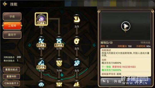 学者这个角色共有两个职业方向,分别是工程师和炼金术士两种,两者职业的特点也少有不同。从个人角度来看,工程师主要是爆发流路线,主要用来刷图和闯关,没有太大的操作含量,而后者则是技巧流英雄,技能之间的搭配流畅,没有什么比较强的单体攻击技能,主要适用于竞技模式。两种职业的走向不同,所以大家在选择的时候一定要想清楚,了解好自身的能力之后再去选择适合你的职业。 【工程师技能加点】