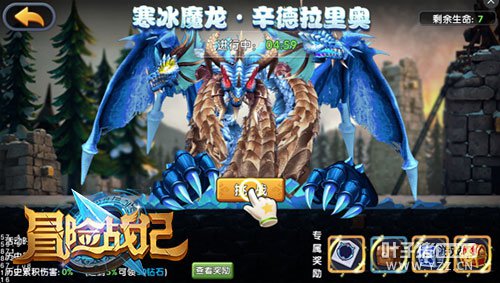 【世界boss限时暴打】 不仅只有单纯的主题任务线,《冒险战记》更有全服玩家热血向挑战的世界boss——魔龙降临在等玩家们加入战斗!每天的20:00——20:15,一场与寒冰魔龙对决,刺激度爆棚的限时战斗。抓紧时间打出高额的伤害,就能爆出超值钻石、道具等奖励,每名玩家默认有7条生命值,提前的准备会让战斗更为超强哦! 对战魔龙 唯我强者