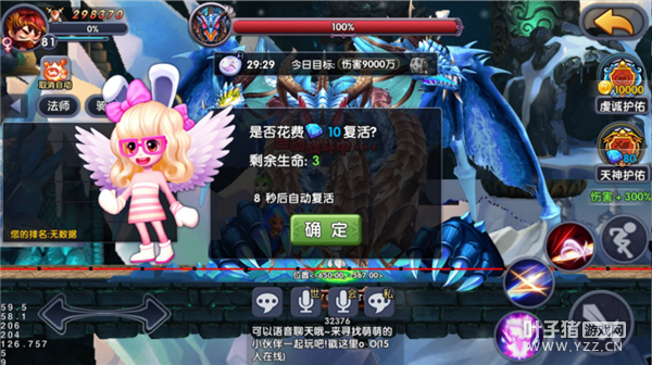 挑战过程中可以使用【虔诚护佑】和【天神护佑】提升伤害,两种加护效果叠加,持续到本次活动结束。 若在挑战过程中死亡,则可以使用默认的生命进行复活,也可以花费钻石购买额外的复活次数。
