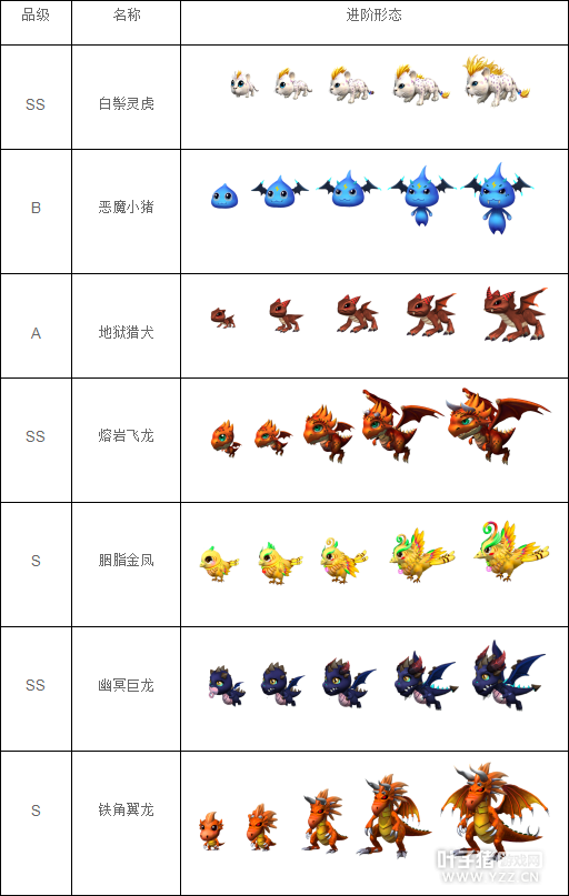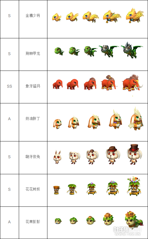 小精灵本身又有5种形态,最初形态是幼儿期,最终形态则是完全体。随着形态的升级,小精灵的属性、技能也会越来越厉害。 部分小精灵图鉴: