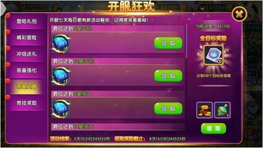 所有玩家在开服第二天即可直接领取奖励丰厚的大礼包,内容为恶魔小猪灵魂石*30,炼羽晶石*5,普通精灵口粮*5,扫荡券*6,以及超酷炫的堕天使羽翼! 福利就仅此而已了嘛?怎么可能!同时开启的还有“帝皇之路”、“竞技奖励”这两项。