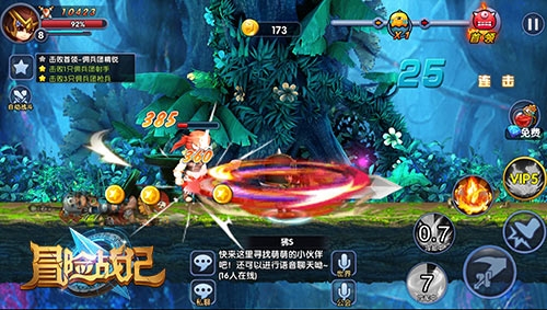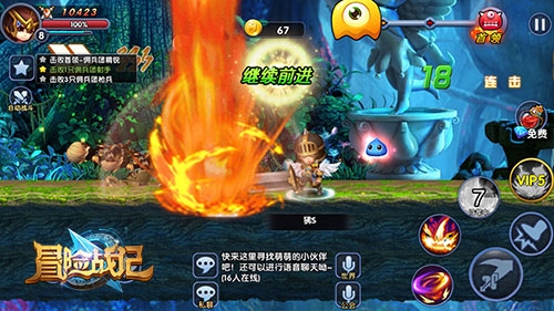 图02 爆屏大招想放就放 【游戏画面:激萌人物原画,跳跃屏幕限制的特效】 一进入《冒险战记》,横版设计将场景大幅度的展现了出来,主色调属于小清新式,UI明亮不狭暗。而大部分玩家都会被人物Q萌的设计所吸引,怪物boss呆萌可爱,跟随人物战斗的小精灵从小养成至大也是精灵古怪的造型。而人物原画也是精美异常,红发冲击的游侠少年身形敏捷,蓝身战甲的圣骑士刀剑稳握,圣光围绕的法师魔杖高举引天而动,特点的表现突出却不突兀。整个游戏最吸引玩家的画面当属战斗效果了,三种职业各有不同,但是招招爆破,炫酷非常,爆屏特效仿佛要穿破屏幕限制,属于真格斗亮技能的战斗表现。