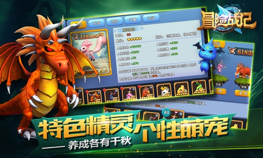 图02 特色Q萌精灵 个性战斗萌宠 《冒险战记》的世界是特立独行的世界,每一个玩家的冒险之旅都是独一无二的体验。想让自己每天开启冒险世界大门的时候都让人眼前一亮吗?想要做个性特别的自己每天拥有独一无二的外貌吗?百变的外形系统让你享受独特的主角体验!从头饰到到武器,甚至连面部表情都可以有多个选择,无论是变装毛绒玩偶搞怪可爱,还是西装正领帅气逼人,只要轻轻一点,全部收入囊中。开测期间,每天都来幸运转盘摇一摇,就有可能获得时装碎片和钻石,或首度充值任意金额即可收到时装大礼包,魔法师套装和金币钻石一包齐发,万千造型的变幻就在一指点击间!