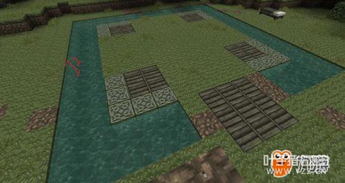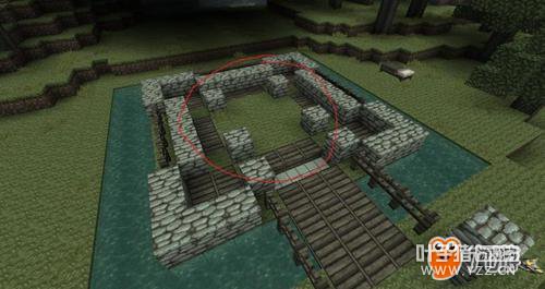 在泥土上修建栅栏后将泥土去除并在原泥土和桥下填充为水完成护城河的修建。在箭头所指处挖去泥土并修建石砖台阶。