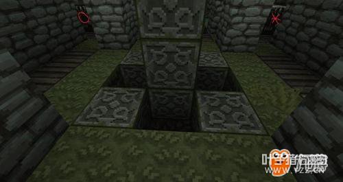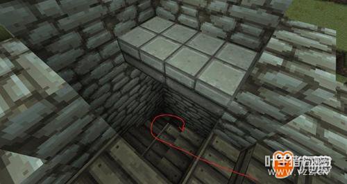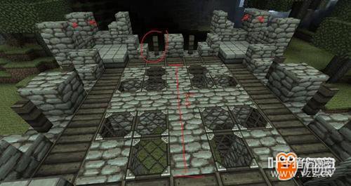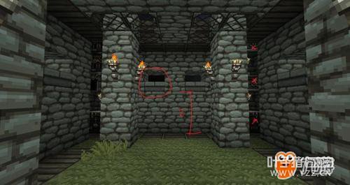 此处为一楼入口处,在圆圈所示处修建石质台阶作为窗口,考虑到美观因素,您只能跳起来才能看到外面的景色了…… 注:在*处可以安放箱子。