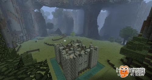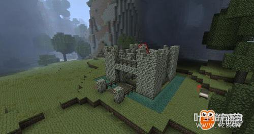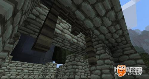 在四角塔楼处继续添加圆石、圆石楼梯以及石砖台阶,如图所示。