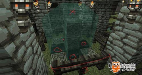 在中间修建十字形圆石结构并在四周填充以玻璃。在圆圈所示位置添加栅栏可以使您免遭摔落之虞。 注:在*处适合安放火炬