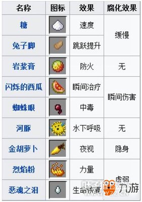 2.二级材料:将给予粗制的药水一个特定的效果但不会改变药水的强度和时间。 当直接加入到一个水瓶中,任何的这些材料都会造出平凡的药水(发酵蛛眼例外,它会造出虚弱药水,以及金萝卜,它不能被加入到水瓶中来制造药水)。