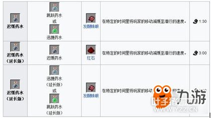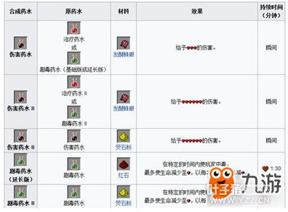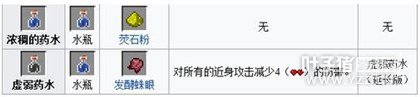 3.三级药水:通过将单个材料酿造与一个二级或另一个三级药水来制造并可以和火药合并来制造它们对应的喷溅药水。 ①正面效果