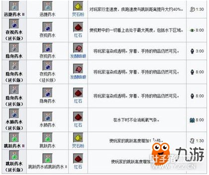 2.二级药水:通过将单个材料酿造与一个基础药水来制造并可以和火药合并来制造它们对应的喷溅药水。 ①正面效果
