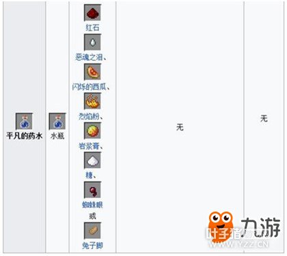 三、药水 1.基础药水:都是通过在水瓶里加入单个材料制作而来的。平凡的药水和虚弱药水可以和火药结合来创造出对应的喷溅药水。