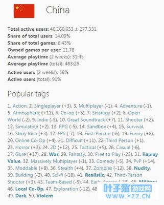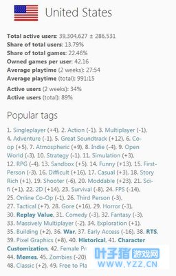 同时,马云称阿里要不要做游戏,一直处于道德的挣扎。如果都是这样的游戏,我们应该为为老人设计一些有意思的东西,为孩子做一些跟教育、知识成长、文化有配合的东西。但阿里还没这个能力,还在构思过程中。 2 、 Steam 国区活跃用户破 4 千万 超越美国成全球第一 日前, SteamSpy 更新了 Steam 的新数据, Steam 国区活跃用户已突破 4000 万,正式超越美国成全球第一。目前, Steam 活跃用户数国区第一,美区次之,俄区仍排第三。此外, Steam 国区玩家在 2 周内的活跃数最高,游戏市场也是世界第一。