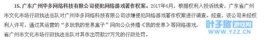 3 、多玩《我的世界》盒子涉嫌侵权被罚 27 万 据国家版权局日前公布的相关公告显示,“多玩我的世界盒子”因涉嫌侵权被罚 27 万元。据悉,《我的世界》由微软旗下的 Mojang 工作室研发并推出,网易取得《我的世界》中国大陆地区的代理权。网易于 2017 年 5 月称“多玩盒子等第三方平台开发者的权益,并向多玩系三公司发出停止侵权函。 2017 年 7 月,多玩盒子下架《我的世界》游戏资源,并关闭充值功能。