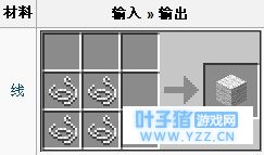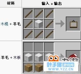 注意: 任何颜色的羊毛都能使用,但不会影响产品的样子。 有色羊毛 只要羊毛和染料都在制作格子里,它们的位置并不重要。 合成表专区首页 指令大全资源合集 |