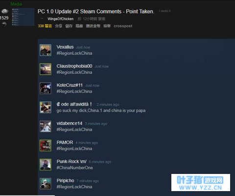 之前他们还创建了一个#RegionLockChina (请锁中国区)的标签,在Steam评论区,Twitter,reddit等平台刷屏,抵制中国玩家。 很多玩家认为中国玩家破坏了游戏的体验、让整个社区非常不健康。