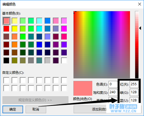 win10画图软件 上图箭头所指的红绿蓝算是所选颜色的配比吧。 (貌似是光的三原色) 颜色值的计算方法是:红色值×65536 + 绿色值×256 + 蓝色值。 以上图所选颜色为例:255×65536 + 128×256 + 128 = 16744576 计算好的颜色值填到命令中:Colors:[16744576] /summon fireworks_rocket ~ ~ ~ {LifeTime:20,FireworksItem:{id:fireworks,Count:1,tag:{Fireworks:{Explosions:[{Type:4,Flicker:1,Trail:1,Colors:[16744576],FadeColors:[]}]}}}}