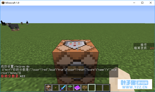 显示 一个玩家在一个记分板目标里的分数 。 若该玩家没有被该记分板目标追踪,则什么都不显示。此参数存在时完全忽略 text 中的内容。该score对象包含三个键:name,objective,value。 name : 要被显示分数的玩家的名字。可使用目标选择器(例如@p)。另外,如果名称为“*”,会显示读者自己的分数(例如,/tellraw @a {"score":{"name":"*","objective":"money"}} 将给每个在线玩家显示他们自己在“obj”目标里的分数)。 objective :要显示分数的记分板。 value :可选。如果存在,将以此值覆盖目标原先的分数。 利用04期的记分板写个例子:/tellraw @a [{"text":"你的分数是:","color":"red","bold":"true"},{"color":"reset","score":{"name":"*","objective":"money"}}]
