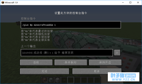 4号命令方块 这个命令方块连锁上一个3号命令方块。如果3号命令方块检测到玩家金币足够,则这个命令方块内的命令会扣除最近的玩家在money记分板上的128分。命令格式见上文。 5号命令方块 输入:/give @p minecraft:saddle 1 设为 连锁 条件制约 保持开启。