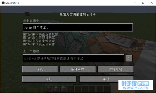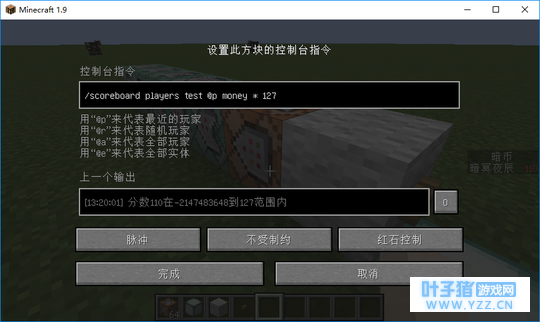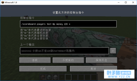 1号命令方块 这个命令是检测最近的玩家在money记分板上的分数是否在-2147483648到127的范围内(我卖的是鞍,定价为128)。命令格式见上文。 2号命令方块 中输入:/w @p 暗币不足 设为 连锁 条件制约 保持开启 (条件制约限制只有上一个命令方块执行成功才会执行自己的命令)。